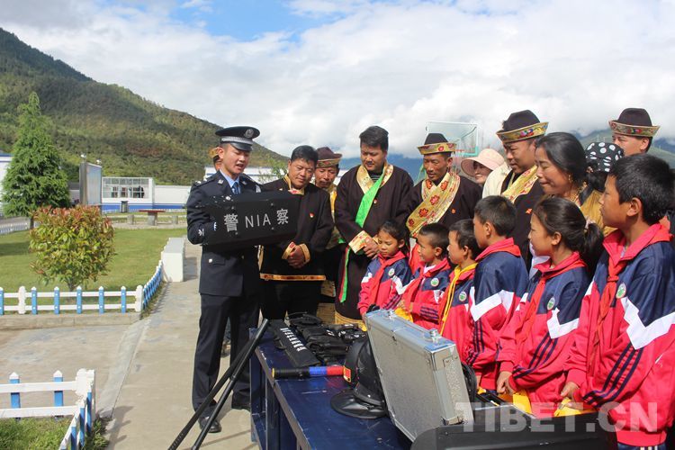 圖為羌納邊境派出所民警正在向轄區(qū)老黨員和小學生展示警械 攝影:李成