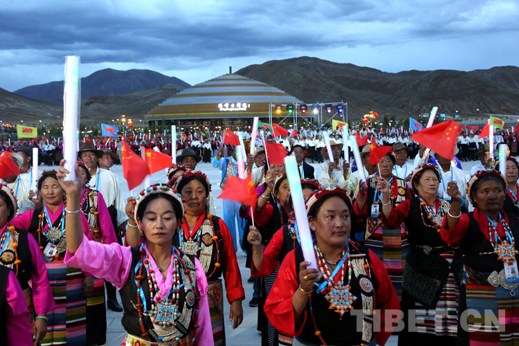 珠峰文創(chuàng)園區(qū)的聯(lián)歡活動分為三個章節(jié),以《在燦爛的陽光下》《各族人民感恩黨》《西藏人民齊歡唱》三首歌曲作為開篇樂,來自日喀則各族各界的演員們,身著日喀則特色節(jié)日盛裝,在廣場中央,擺出數(shù)字“100”的造型,跳起歡快的鍋莊舞,在燈光的輝映下,造型美輪美奐。