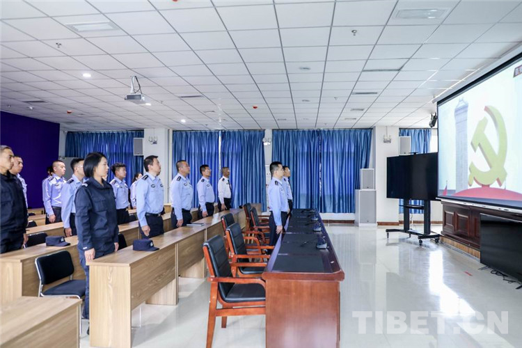 圖為拉薩鐵路公安處民警通過(guò)直播與大會(huì)現(xiàn)場(chǎng)同唱《國(guó)際歌》 攝影:黃飛