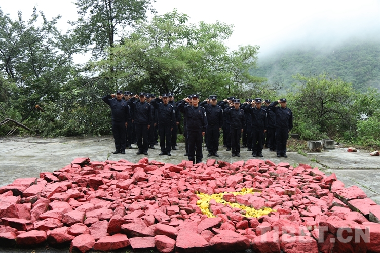 圖為機關(guān)民警在石頭堆砌的黨旗前重溫入黨誓詞 攝影:鄒興國