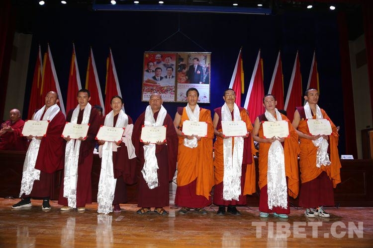 畢業(yè)典禮上,學院第三屆預(yù)備班111名學員被授予“聶當?禪然巴”初級學銜,2017級學制班130名學員被授予“智然巴”中級學銜,其中密宗班33名學員,由中國佛教協(xié)會西藏分會與西藏佛學院,共同授予“聶當?額然巴”學銜。