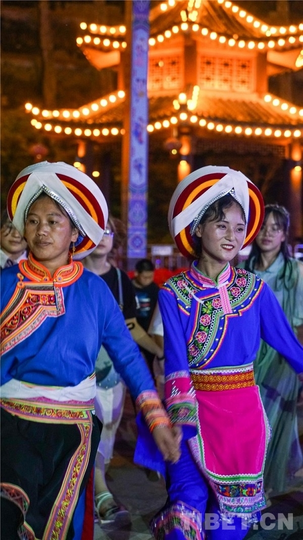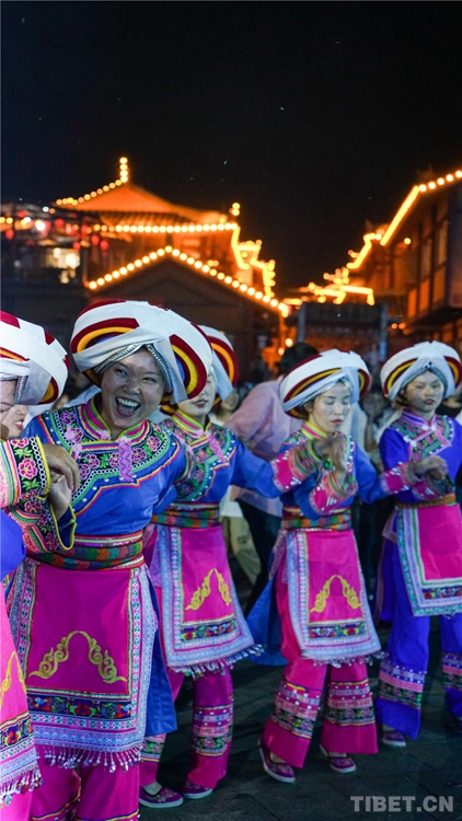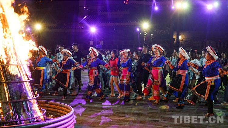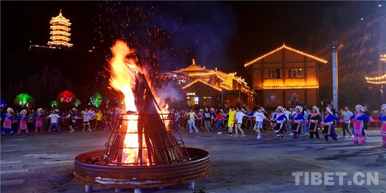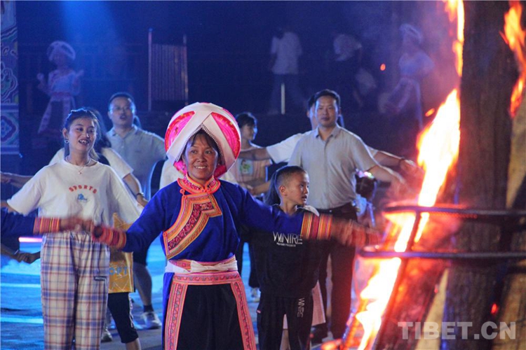 中國西藏網(wǎng)訊 當(dāng)陣陣涼風(fēng)襲來,暑氣漸消,暮靄沉沉。碧水青山環(huán)抱的阿妹戚托小鎮(zhèn)卻漸漸躁動起來,熱騰的火苗將夏夜“點(diǎn)燃”,人們環(huán)繞火把載歌載舞、歡唱高歌,沉醉其中、樂而忘返。