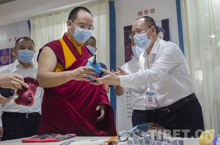 圖為吉福社區(qū)工作人員向班禪展示手工藝品 攝影:歐帆