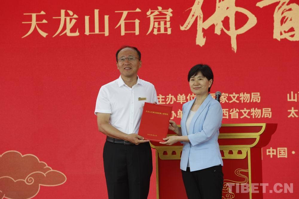 圖為國家文物局政策法規(guī)司司長陸瓊(右)向天龍山石窟博物館館長于灝頒發(fā)文物入藏清冊