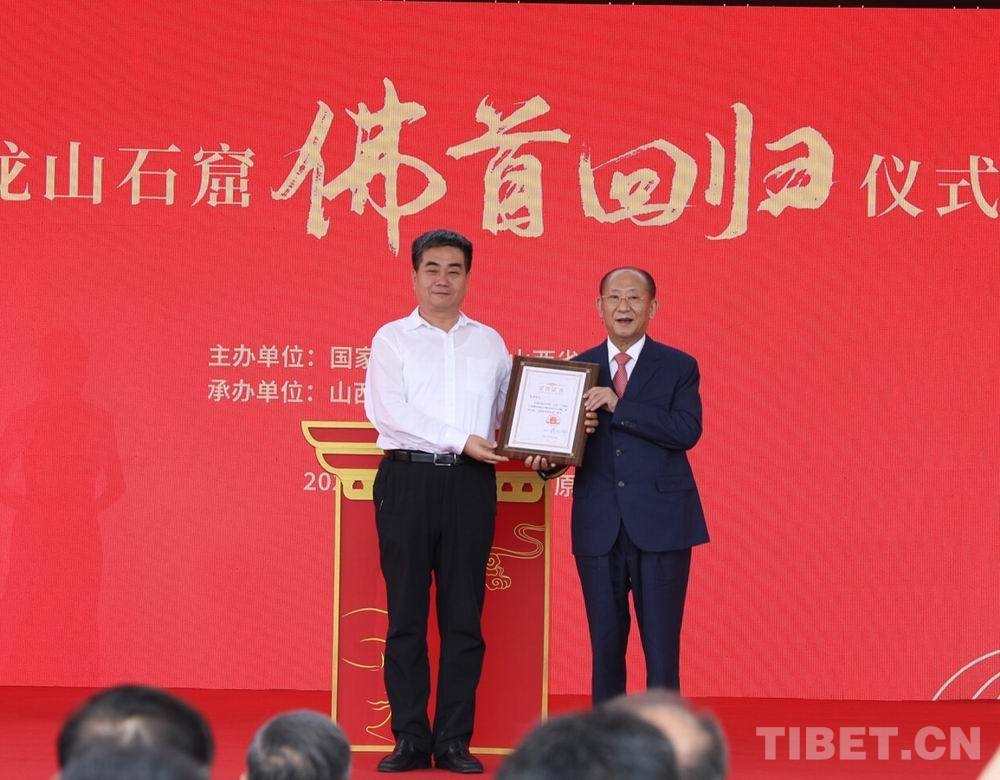 儀式上,國家文物局政策法規(guī)司司長陸瓊向天龍山石窟博物館館長于灝頒發(fā)文物入藏清冊。太原市委副書記、市長張新偉向佛首捐贈人張榮頒發(fā)“榮譽市民”證書。張榮表示將太原市政府頒發(fā)的獎金捐出,用于支持文物追索返還工作。