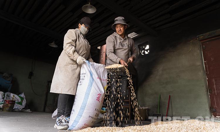 圖為西德稞原地食品有限公司工人正在將炒制完成的青稞裝袋