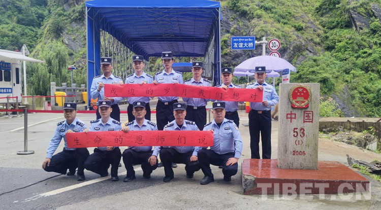 圖為友誼橋執(zhí)勤點(diǎn)全體民警在界碑前對自己的恩師“表白” 攝影:尼瑪云丹