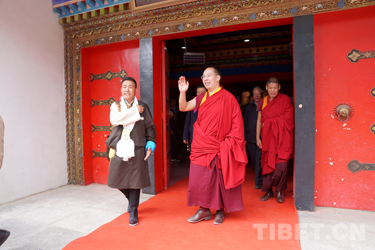 紀(jì)念館外,聞訊而來的信教群眾手捧哈達(dá),迎候班禪并恭祝“扎西德勒”。班禪在走進(jìn)紀(jì)念館前后,揮手向群眾回以祝福。