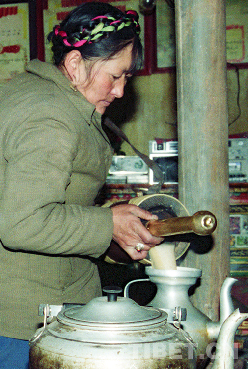 然后,她們又將煮好的濃茶,與酥油一道潷入另一個(gè)木制小酥油桶里,雙手握著長長的木塞,打起酥油茶。直到桶內(nèi)聲音從“咣當(dāng)、咣當(dāng)”變成“嚓伊、嚓伊”時(shí),茶、酥油、鹽等即混為一體,酥油茶便打好了。一天所需的酥油茶制作完工后,再去做其它事情……