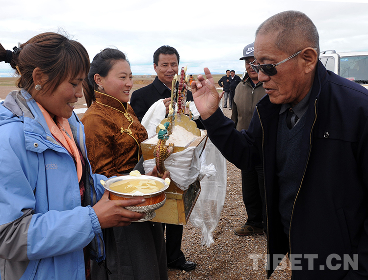 這是那曲地區(qū)雙湖特別區(qū)(現(xiàn)那曲市雙湖縣)的青年在向來訪的老領(lǐng)導(dǎo)洛桑丹珍敬青稞酒(唐召明2013年7月25日攝)