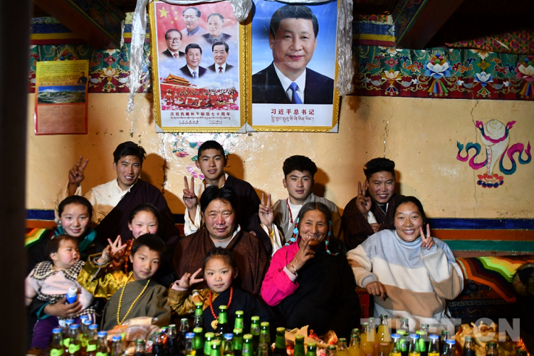 “尼瑪,拉姆,快過來獻哈達了!”索朗仁青一邊招呼著自己的孫子、孫女,一邊整理著手中的哈達?!跋蝾I(lǐng)袖獻哈達是我們家每年不變的傳統(tǒng),我們永遠感謝偉大領(lǐng)袖,感謝共產(chǎn)黨?!彼骼嗜是嘁患仪f嚴面向墻上懸掛的領(lǐng)袖像,高舉哈達,齊聲祝福:“扎西德勒!”