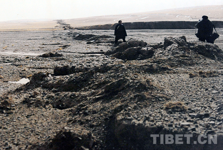 在便攜式衛(wèi)星儀的導(dǎo)航下,考察組人員歷盡千辛萬苦,終于來到了瑪尼地震的極震區(qū)瑪爾蓋茶卡湖東北角的地震破裂帶。車剛停下,徐錫偉、曹忠權(quán)和侯康明便跳下來,一邊跑一邊欣喜若狂地喊著“地表破裂帶!”就連兩位司機(jī)也連忙下車來看個(gè)究竟,他們用形象生動(dòng)的語言說:“像拉鏈一樣把大地拉了一條大縫?!比豢瓶缄?duì)員在興奮之余,忘記了饑餓和疲勞,開始測(cè)量起地表破裂帶的寬度、位移量,觀察地表破裂帶的幾何結(jié)構(gòu)特征,司機(jī)將大米淘好,準(zhǔn)備點(diǎn)火做飯,卻發(fā)現(xiàn)水是咸的。而此時(shí)車上的礦泉水只剩下6瓶,每人只能分到一瓶多,水已關(guān)系到科考隊(duì)員的“國計(jì)民生”。