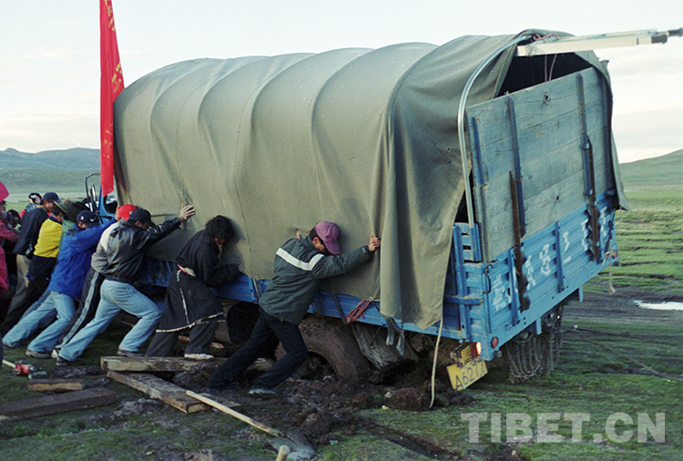 這是科考人員在奮力推出陷進(jìn)藏北無人區(qū)沼澤地帶的科考卡車(唐召明2001年攝)