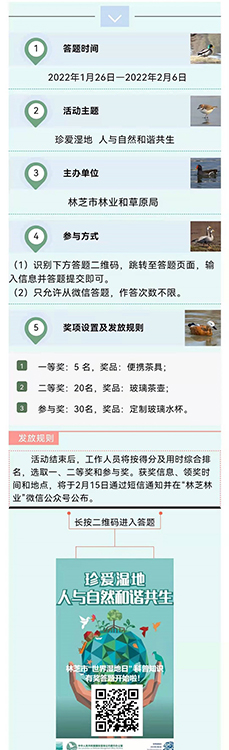 記者從“林芝林業(yè)”微信公眾號(hào)獲悉,為廣泛宣傳普及濕地保護(hù)知識(shí),提升公眾濕地保護(hù)意識(shí),進(jìn)一步激發(fā)廣大群眾參與濕地保護(hù)和生態(tài)文明建設(shè)的熱情,西藏自治區(qū)林芝市特意在第26個(gè)“世界濕地日”來臨前開展了“世界濕地日”有獎(jiǎng)答題活動(dòng)!