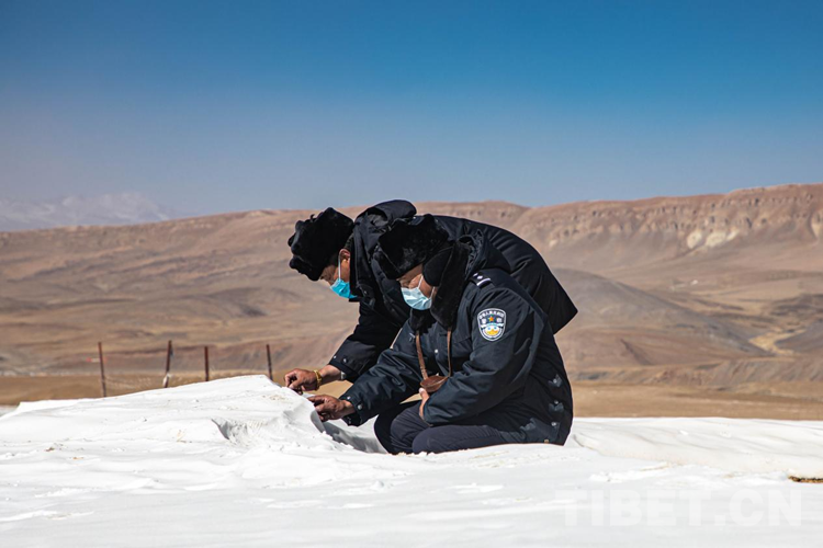 到達踏查點,那里有一個由大小差不多的石頭壘起來、高50厘米左右的半圓形石堆,這就是他們踏查的避風(fēng)港。普瓊手執(zhí)國旗佇立在石頭上,嘎色拿出胸前的望遠鏡,觀察四周有無異樣。風(fēng)不停地襲擾,但他們就像雕塑一樣,誓死捍衛(wèi)著腳下的領(lǐng)土。