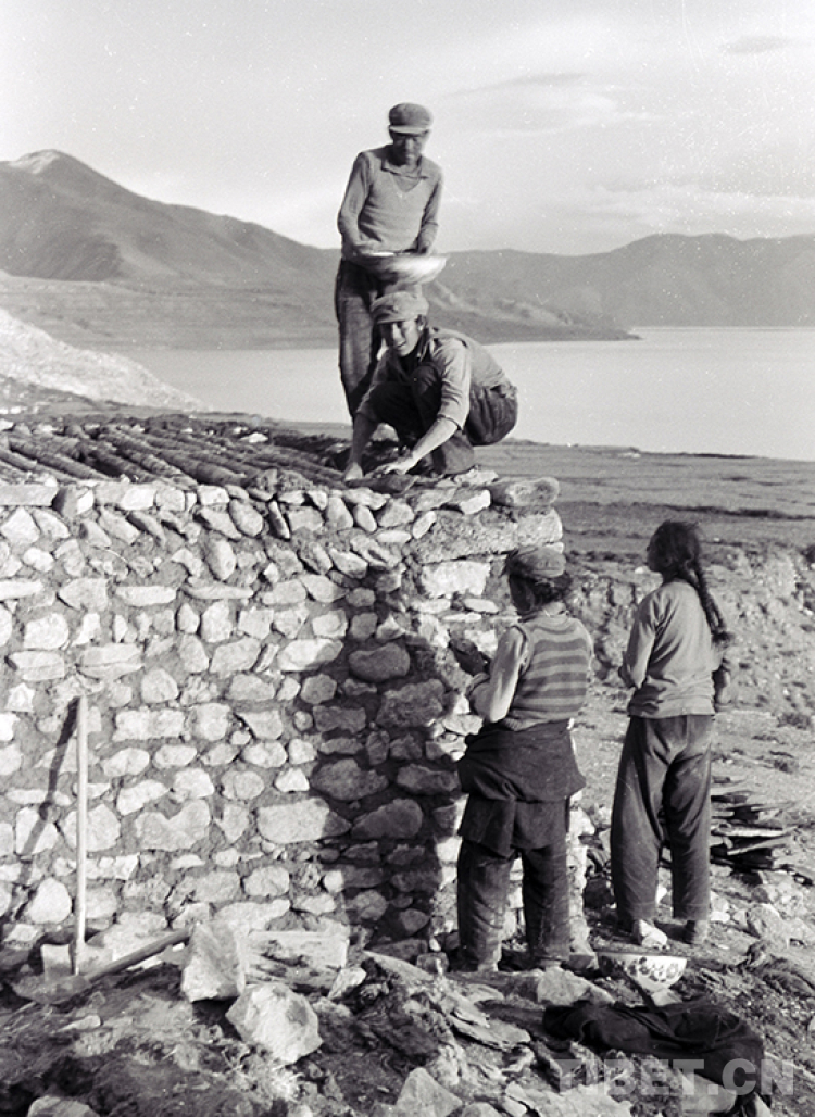 這是文部辦事處文部區(qū)文部鄉(xiāng)(現尼瑪縣文部鄉(xiāng)南村)的村民在當惹雍錯湖畔蓋石屋(唐召明1987年攝)