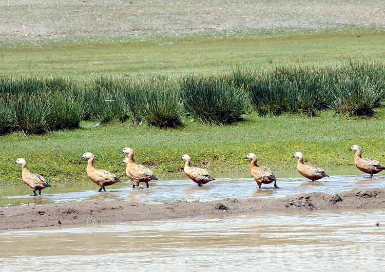 這是在藏北申扎縣境內排隊行走的赤麻鴨(唐召明2009年攝)