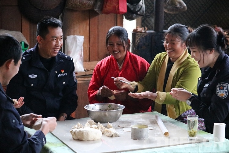 圖為背崩邊境派出所民警與白瑪央金一家包藏餃 攝影:呂恒剛