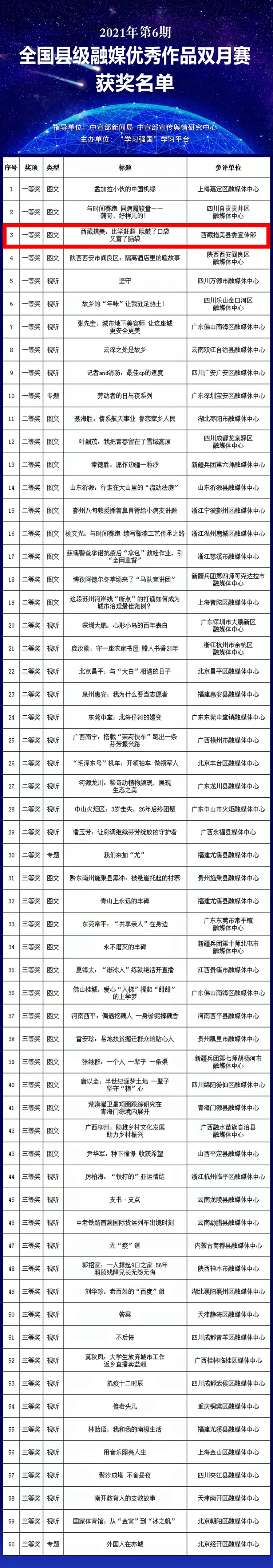 據(jù)了解,2021年第6期全國縣級融媒體中心優(yōu)秀作品雙月賽由中宣部新聞局、中宣部宣傳輿情研究中心指導,“學習強國”學習平臺主辦,各?。▍^(qū)、市)和新疆生產(chǎn)建設兵團學習平臺協(xié)助組織、共同實施,各省級學習平臺對投稿作品進行初評,評選出299件優(yōu)秀作品,“學習強國”學習平臺組織專家評審團隊對優(yōu)秀作品進行復評、終評,最終評選出60件獲獎作品。