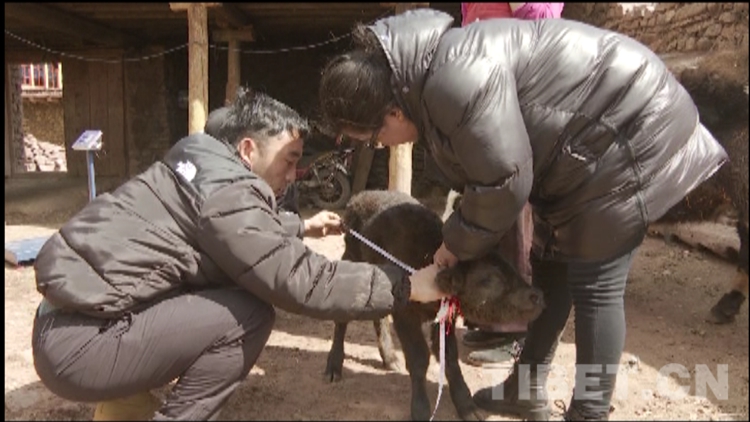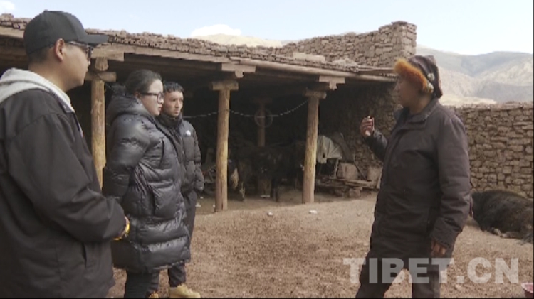 圖為貢覺縣畜牧站工作人員給村民索朗桑布指導(dǎo)飼養(yǎng)保暖措施