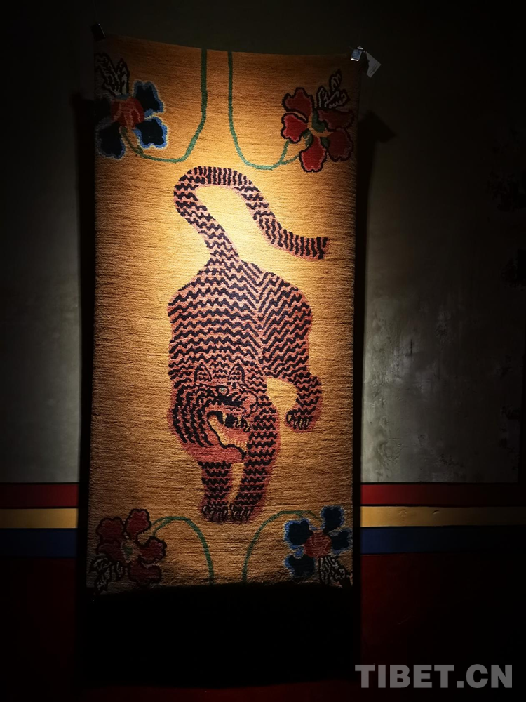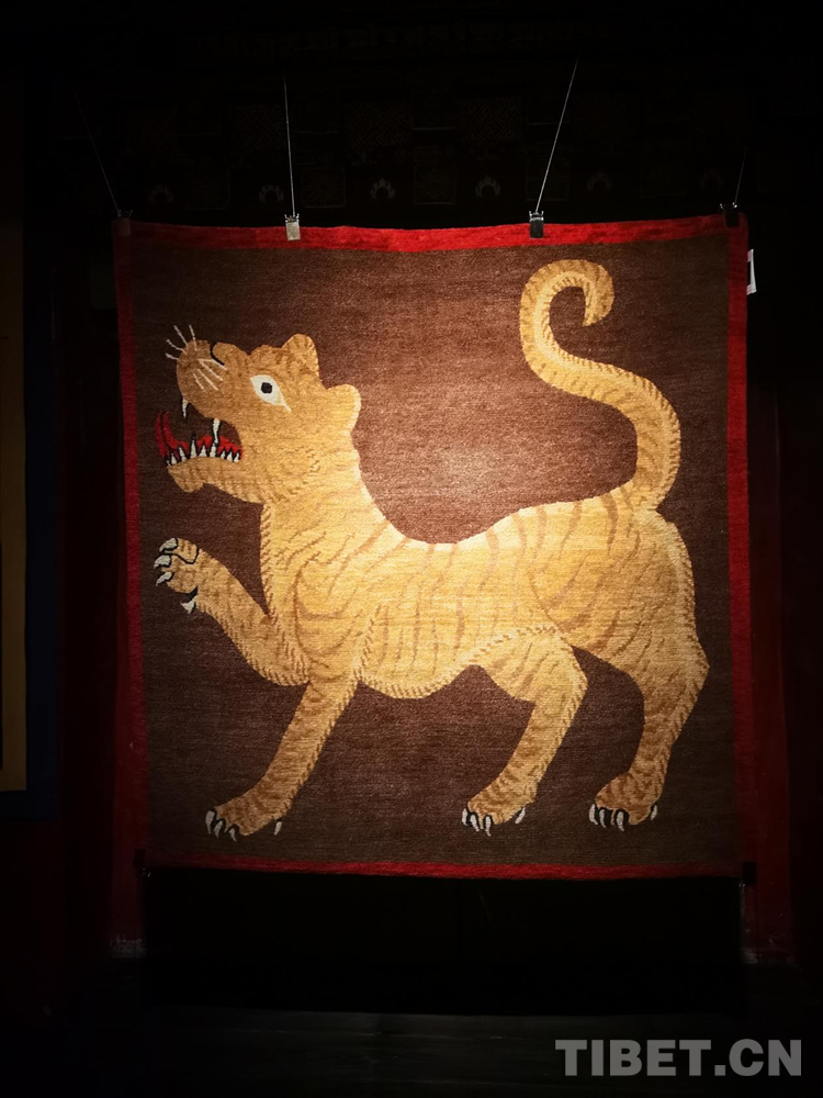 生活在不同地區(qū)的中華民族先民們都不約而同地有著對虎的崇拜和描繪。據(jù)了解,“云從龍,風(fēng)從虎”在中國古代先秦時期,虎一度與龍并列而成為權(quán)力和力量的象征。根據(jù)相關(guān)文獻記載,早在5000年前,西藏阿里地區(qū)的居住者就將虎皮紋飾等符號刻在巖石上;公元7世紀前后,松贊干布曾頒布《三十六制》,提到“虎皮褂、虎皮裙、虎皮袍”等成為“六勇飾”,只有獲得地位和相當成就的人才能佩戴,虎的圖案也自此融入地毯等西藏織物中。