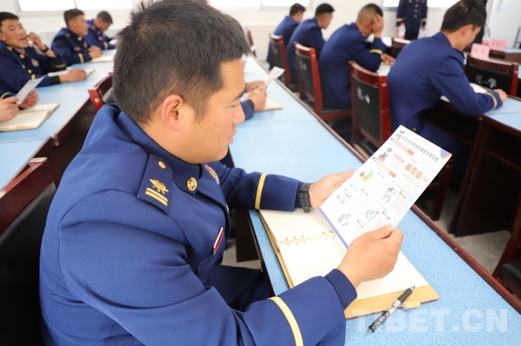 圖為該中隊隊員認(rèn)真閱讀防范電信網(wǎng)絡(luò)詐騙宣傳手冊