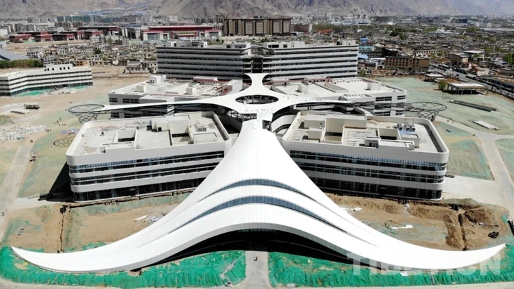 中國西藏網(wǎng)訊 挖掘機的轟鳴聲、鋼管的碰撞聲,走進西藏自治區(qū)醫(yī)院項目施工現(xiàn)場,一派忙碌的景象。從空中俯瞰,建設(shè)中的西藏自治區(qū)醫(yī)院外形宛如一朵格桑花,目前正進行室內(nèi)裝修和機電安裝。