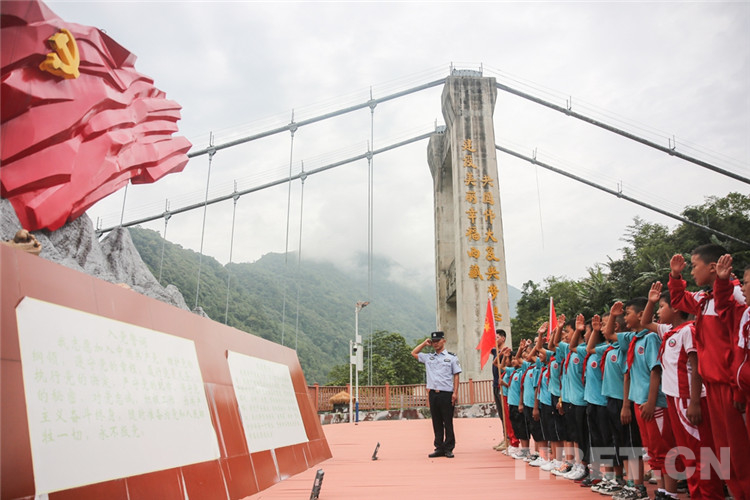 圖為背崩邊境派出所民警在解放大橋愛國強(qiáng)邊教育基地為學(xué)生講解“老墨脫精神”