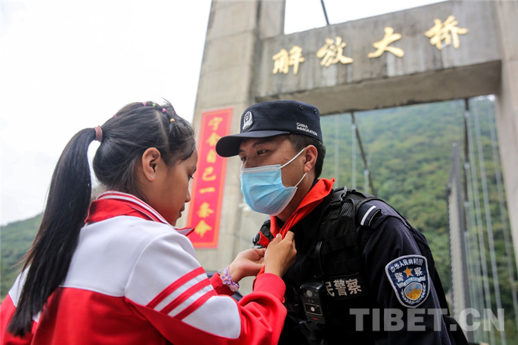 圖為學(xué)生為解放大橋的背崩邊境派出所執(zhí)勤民警系上紅領(lǐng)巾