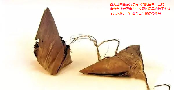 1988年,在江西省德安縣的南宋周氏墓中出土了迄今為止世界考古中發(fā)現(xiàn)的最早的粽子實(shí)體。有趣的是,開棺時(shí),工作人員發(fā)現(xiàn),墓主的手上拿著一根桃木枝,而桃木枝上掛著的,赫然是兩個(gè)實(shí)體粽子。用粽子作陪葬品很少見,據(jù)考古專家分析,墓主逝去于四月初十,大殮正值端午節(jié)前,可能生前愛吃粽子,所以就作為了陪葬品。據(jù)碑文記載,墓主周氏葬于公元1274年,所以,這是一對穿越了近750年時(shí)光來到我們面前的粽子。這對粽子呈菱角形,長6厘米、寬3厘米,外皮為粽葉,用天然蘆葦葉麻線捆扎,制作手法和材料與我們現(xiàn)在的粽子非常相近。這對珍貴的南宋粽子目前保存在江西省德安縣博物館。