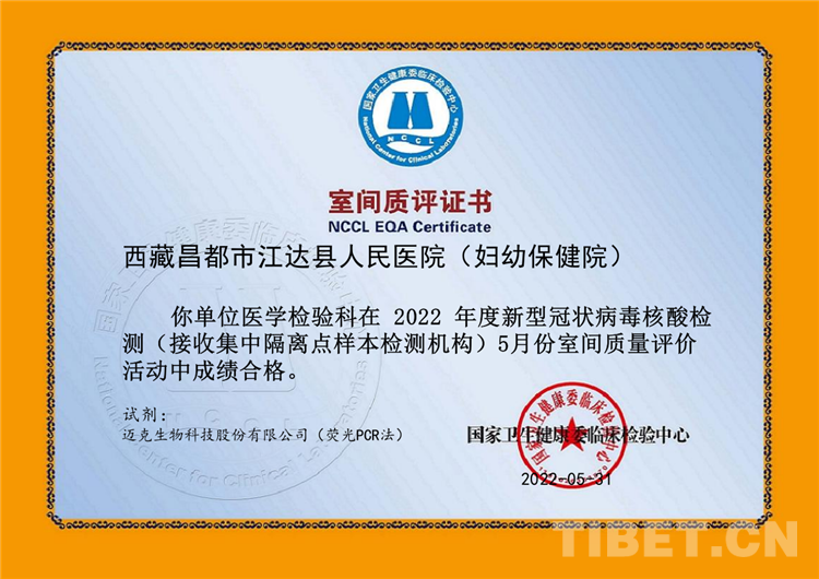 中國(guó)西藏網(wǎng)訊 近日,國(guó)家衛(wèi)生健康委臨床檢驗(yàn)中心公布了2022年4月和5月新型冠狀病毒核酸檢測(cè)(接收集中隔離點(diǎn)樣本檢測(cè)機(jī)構(gòu))的室間質(zhì)評(píng)結(jié)果,西藏自治區(qū)昌都市江達(dá)縣人民醫(yī)院核酸檢測(cè)實(shí)驗(yàn)室順利通過“國(guó)家衛(wèi)健委臨床檢驗(yàn)中心”新冠病毒核酸檢測(cè)室間質(zhì)評(píng),標(biāo)志著江達(dá)縣人民醫(yī)院新型冠狀病毒核酸檢測(cè)能力獲得國(guó)家權(quán)威機(jī)構(gòu)的認(rèn)可。