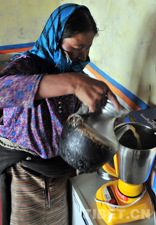這是班戈縣新吉鄉(xiāng)術后的斯求卓瑪向放入酥油的電動攪拌壺里倒茶水,準備用電來打制酥油茶(唐召明2015年7月14日攝)