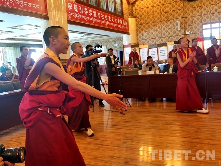 據(jù)了解,與傳統(tǒng)寺廟教育相比,西藏佛學院開設(shè)有文化課和佛學兩大體系,天資聰慧的少年活佛們在校期間已經(jīng)開始研習含義深刻、博大精深的《五部大論》《入菩薩行論》等佛教經(jīng)典作品,目前已經(jīng)可以流暢地背誦部分經(jīng)典。在當日的學習成果匯報展示會上,少年活佛們不僅展示了藏漢雙語朗誦、藏漢文書法、英語情景劇等,也為大家?guī)砹恕度肫兴_行論》第一章的背誦展示和辯經(jīng)展示。