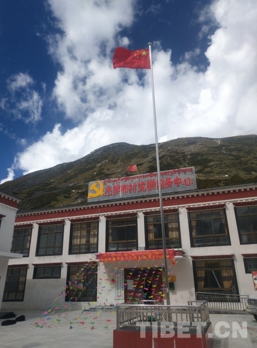 圖為杰羅布村迎風(fēng)飄揚(yáng)的五星紅旗