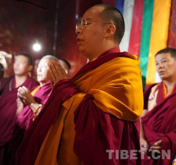 圖為班禪在羊堅多康殿波米仁波切靈塔前誦經(jīng)祈禱 攝影:王淑