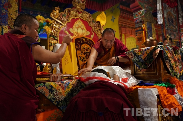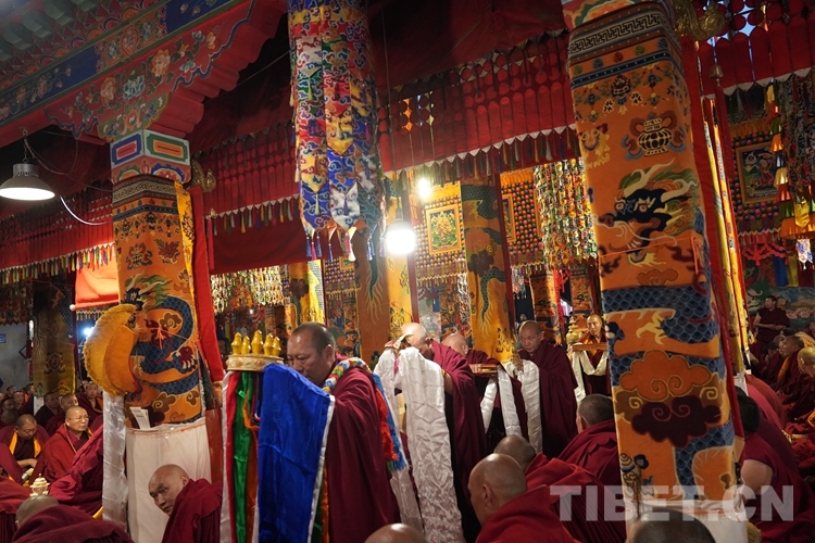 法號齊鳴、法鑼合奏,眾僧以隆重的宗教儀軌迎接班禪。班禪抵達(dá)藏傳佛教格魯派祖寺甘丹寺后在僧眾的簇?fù)硐?,先后步入羊堅多康殿、宗喀巴大師靈塔殿、十八羅漢殿朝拜、誦經(jīng)、敬獻(xiàn)哈達(dá)。