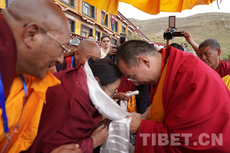 現(xiàn)年80歲高齡的桑頂?多吉帕姆德慶曲珍活佛在僧人的攙扶下前來(lái)迎接,班禪見到桑頂多吉帕姆活佛疾步向前,與桑頂多吉帕姆活佛互獻(xiàn)哈達(dá),行碰頭禮,互致問候。