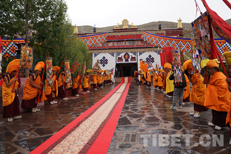 上午12時(shí)許,班禪抵達(dá)桑頂寺時(shí),天降甘露、法號(hào)齊鳴、嗩吶喧天,桑頂寺僧人組成的儀仗隊(duì)在寺廟門口舉行了隆重的歡迎儀式。