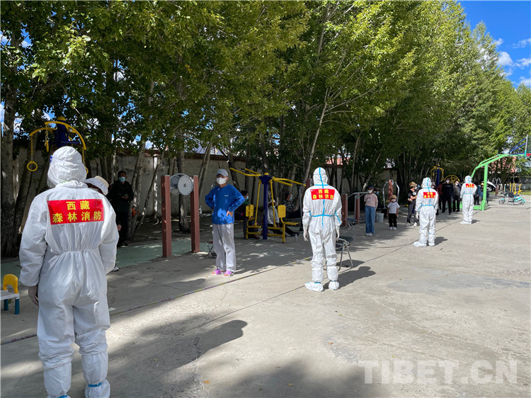 拉薩市森林消防特勤大隊出動135名救援隊員,在拉薩市城關(guān)區(qū)加榮社區(qū)、塔瑪社區(qū)、藏?zé)嵘鐓^(qū)、納如社區(qū)等9個地點開展核酸檢測秩序維護、防疫物資搬運和防疫消殺等工作。