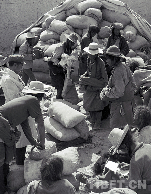 這是文部辦事處牧民群眾來到辦事處畜產(chǎn)品收購站交售羊毛,并將羊毛裝袋過秤完成(唐召明1989年12月攝)