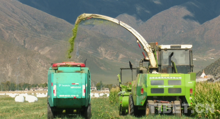 圖為收割機(jī)在達(dá)孜金麥穗合作社的青飼玉米地里收割