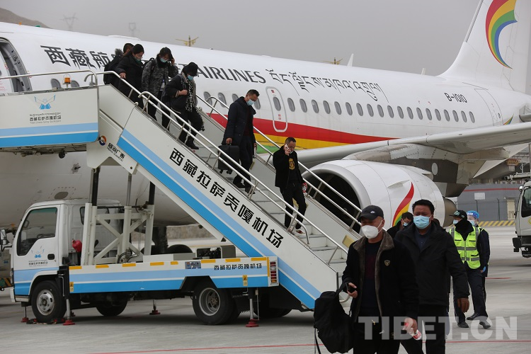 圖為飛機(jī)安全抵達(dá)拉薩貢嘎機(jī)場(chǎng)后乘客有序走下飛機(jī) 攝影:王佳豪