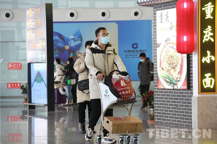 圖為在拉薩貢嘎機(jī)場(chǎng)內(nèi)旅客攜帶西藏特產(chǎn)準(zhǔn)備登機(jī) 攝影:王佳豪