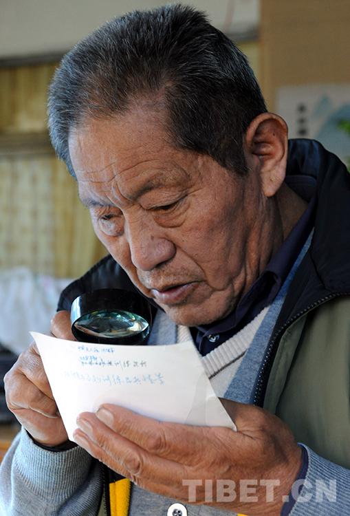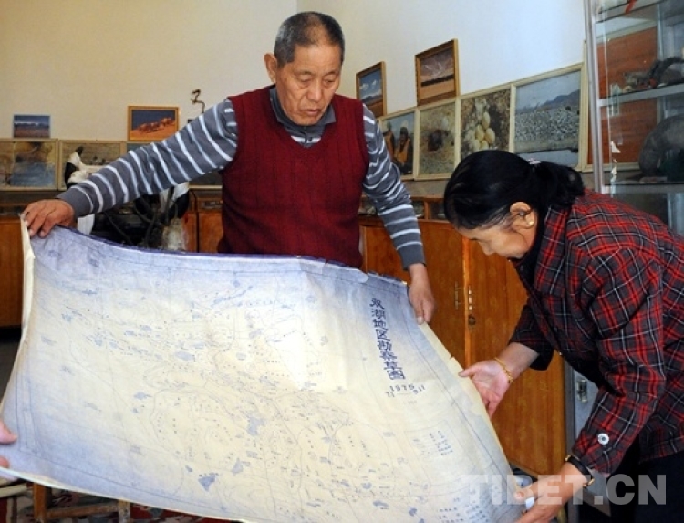 這是洛桑丹珍在家中與老伴曲吉一起整理1975年的“雙湖地區(qū)勘察草圖”(唐召明2012年10月攝)