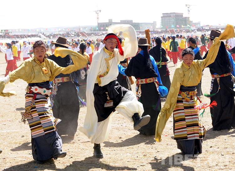這是在藏北首府那曲鎮(zhèn)賽馬會上,牧民群眾正在跳大型”鍋莊“舞(唐召明2013年8月10日攝)