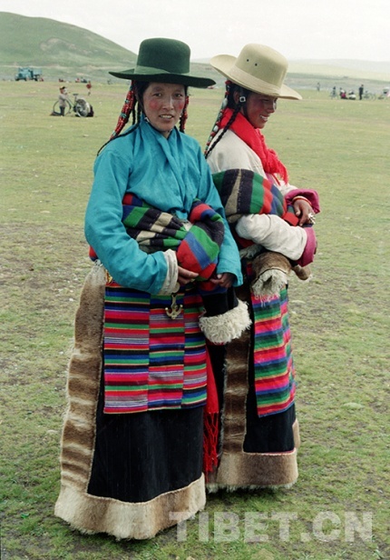這是在藏北首府那曲鎮(zhèn)賽馬會上,兩位參加草原盛會的盛裝牧女(唐召明1987年夏攝)