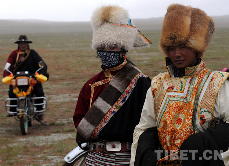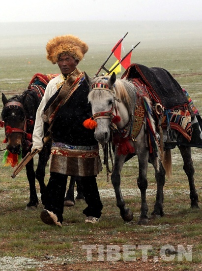 這是在慶祝雙湖建縣活動中,一位盛裝青年牧民冒雪前去參加賽馬比賽(唐召明2013年7月26日攝)