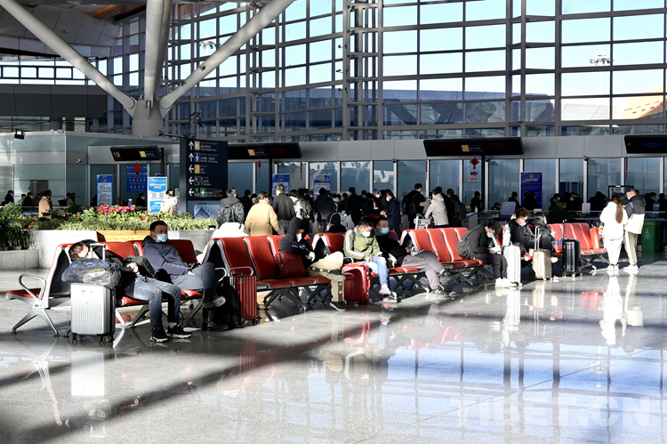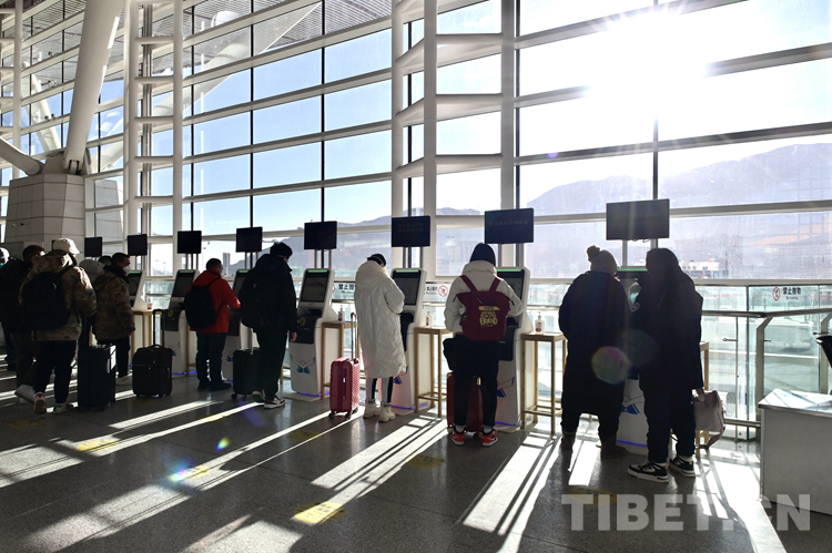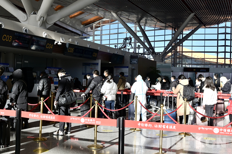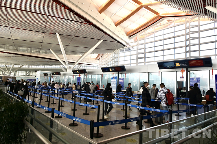 圖為春運(yùn)首日拉薩貢嘎機(jī)場內(nèi)候機(jī)的旅客