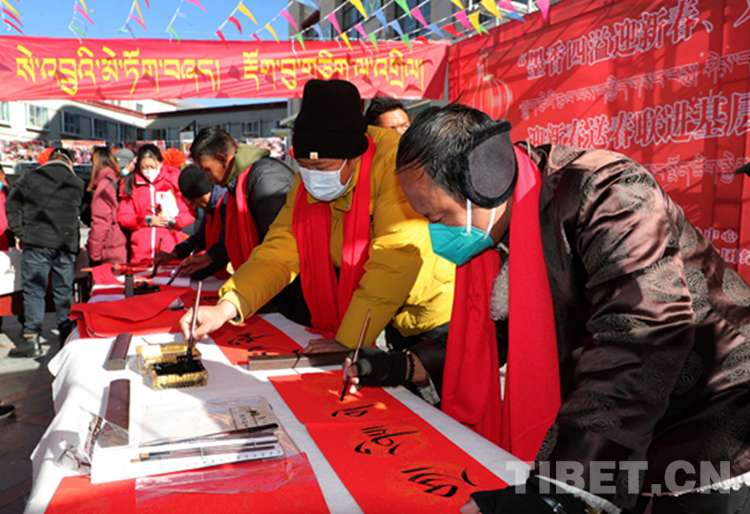 圖為活動(dòng)現(xiàn)場(chǎng)書法家在書寫藏文春聯(lián)