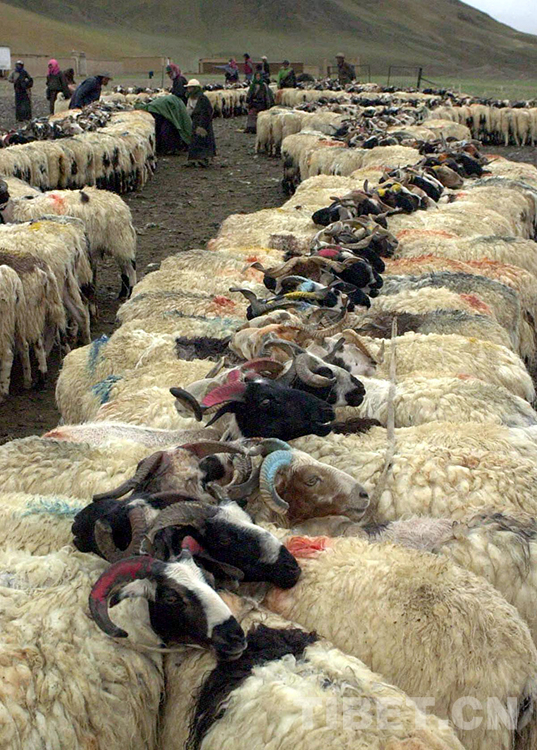 這是藏北雙湖特別區(qū)(現(xiàn)雙湖縣)嘎措鄉(xiāng)牧人用繩子統(tǒng)一拴住羊群角后,準備擠羊奶。該鄉(xiāng)是西藏唯一的一個走集體化經(jīng)營道路的鄉(xiāng)村(唐召明2001年攝)